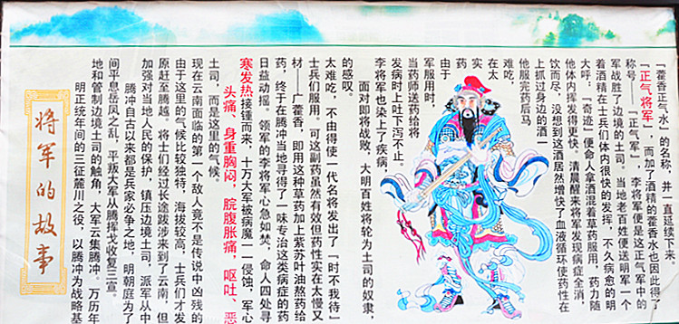 面對即將戰(zhàn)敗,大明百姓將輪為土司的奴隸,李將軍也染上了疾病,發(fā)病時(shí)上吐下瀉不止。當(dāng)藥師送藥給將軍服用時(shí),由于藥實(shí)在太難吃,他服完藥后馬上抓過身邊的酒一飲而盡,沒想到這酒居然增快了血液循環(huán)使藥性在他體內(nèi)揮發(fā)得更快。清晨醒來發(fā)現(xiàn)病癥全消,大呼:“奇跡”便命人拿酒混著草藥服用,藥力隨著酒精在士兵們體內(nèi)很快的發(fā)揮,不久病愈的明軍戰(zhàn)勝了邊境的土司。當(dāng)?shù)乩习傩毡闼兔鬈娨粋€(gè)稱號——“正氣軍”,李將軍便是這正氣軍中的“正氣將軍”,而加了酒精的藿香水也因此得了“藿香正氣水”的名稱,并一直延續(xù)下來。
